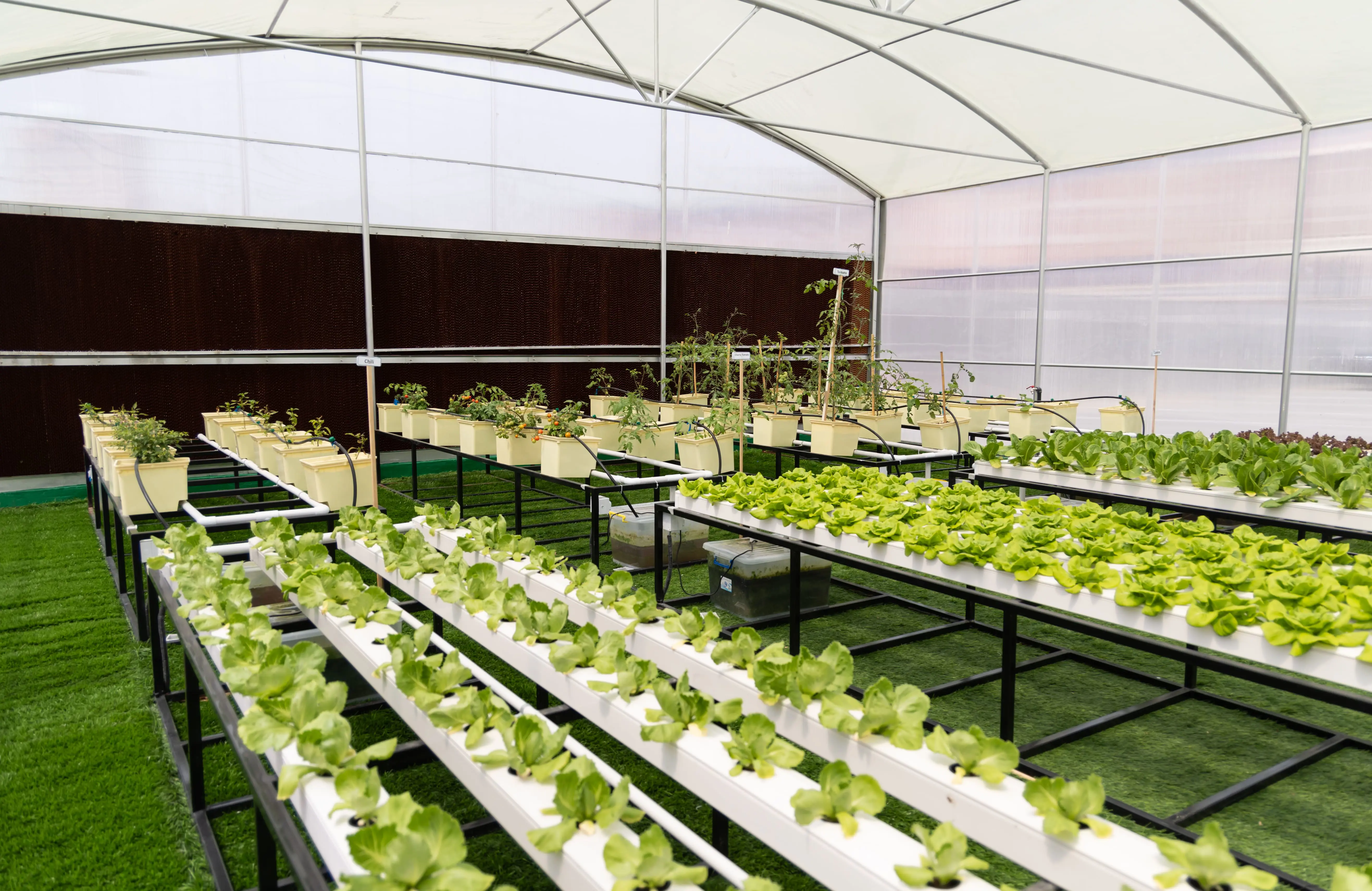 A greenhouse with hydroponics and eco gardens, enabling local food production with minimal environmental impact, teaching about food security.